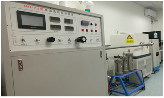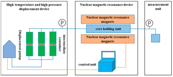 The NMR displacement device is mainly composed of a conventional displacement device and a nuclear magnetic resonance analyzer. The MR-dd high-temperature and high-pressure displacement device is produced by Nantong Huaxing Petroleum Instrument Co., Ltd. (Nantong, China). The MesoMR23-060H-HTHP core low-field nuclear magnetic analyzer is produced by Shanghai Numai Electronic Technology Co., Ltd. (Shanghai, China). The physical diagram and flow chart of the low-field NMR displacement device are shown in Figure 1 and Figure 2. As shown in the figure, the whole equipment is mainly composed of three parts: high temperature and pressure displacement device, nuclear magnetic resonance device, and metering device. The polymer and other fluids are placed in the intermediate container, the sample is placed in the core holder, and the fluid is injected into the core through the displacement pump. The nuclear magnetic equipment can be detected online, the experimental process does not need to be paused, and there is no need to repeatedly take out samples.