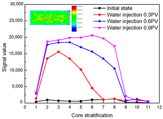 Figure 4. Variation trend of stratified nuclear magnetic signal during water flooding and NMR imaging after saturated water in high-permeability cores.