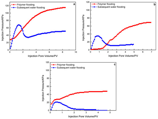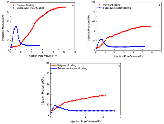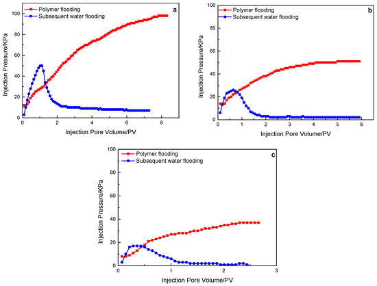 Figure 7. A 19 million molecular weight polymer solution in rock cores with different permeability, the characteristics of the injection pressure of polymer flooding, and subsequent water flooding: (a) 500 mD core; (b) 1000 mD core; (c) 2000 mD core.