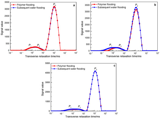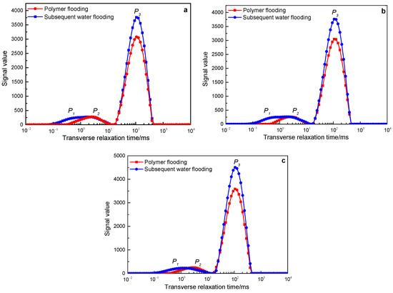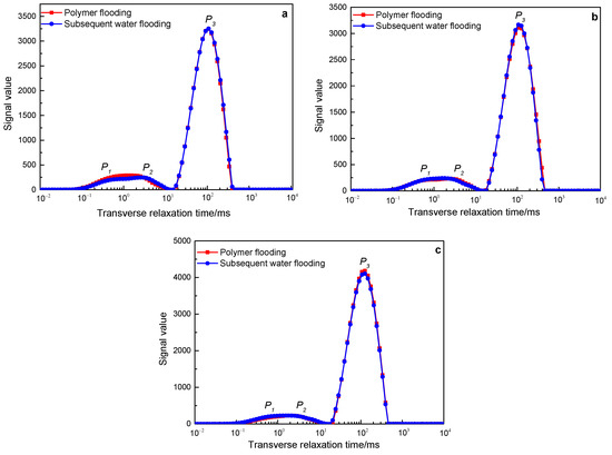 Figure 11. The change characteristics of the NMR T2 spectrum curves of the polymer solution with a molecular weight of 25 million in rocks with different permeability after polymer flooding and subsequent water flooding: (a) 500 mD core; (b) 1000 mD core; (c) 2000 mD core.