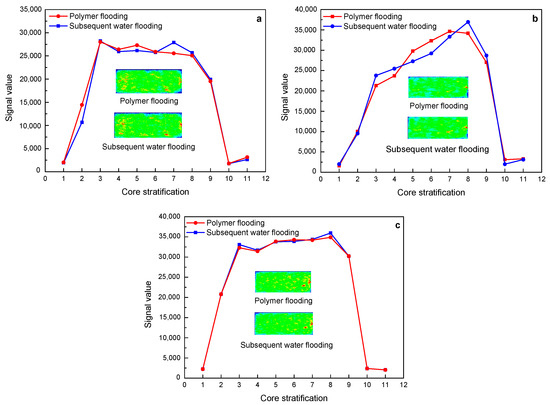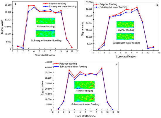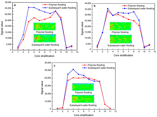 Figure 13. The change characteristics of NMR layering signal and imaging of 19 million molecular weight polymer solutions in rock cores with different permeability after polymer flooding and subsequent water flooding: (a) 500 mD core; (b) 1000 mD core; (c) 2000 mD core.