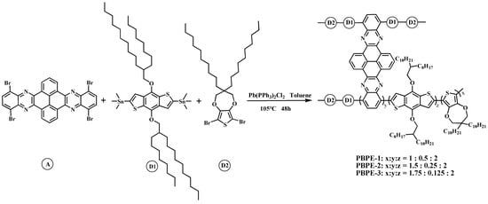 Three D-A type polymers—PBPE-1, PBPE-2 and PBPE-3—were synthesized by Stille coupling reaction. The synthetic route is shown in Figure 1. The molar ratio of the three monomers used in the synthesis of the PBPE-1 polymer was D1:D2:A = 2:1:0.5. The detailed process is as follows: D1 (499.7 mg, 0.4500 mmol), D2 (133.2 mg, 0.225 mmol), A (80.7 mg, 0.1125 mmol), Pb(PPh3)2Cl2 catalyst (18.0 mg, 0.0256 mmol) and 60 mL of toluene were separately added to a 250 mL round-bottom flask. The air in the reaction apparatus was evacuated under a reduced pressure device and replaced with argon three times. The reaction was carried out in an argon atmosphere for 48 h, and the reaction temperature was 105 °C. After completion of the reaction, the solvent was removed by rotary evaporation. The solid sample was purified by Soxhlet extractor and extracted by n-hexane, methanol and acetone for 24 h. Finally, the PBPE-1 solid polymer was dried in an oven with a yield of 81.4%. 1HNMR data of polymer PBPE-1 (Figure S4a) were as follows: 1HNMR (CDCl3, 400 MHz, ppm): 7.45 (s, 21H), 7.19–7.05 (m, 38H), 4.23–3.88 (m, 8H), 1.90 (s, 35H), 1.46–1.04 (d, 240H), 1.01–0.78 (t, 79H), 0.68 (s, 44H); GPC: Mw = 15.50 kDa; Mn = 14.90 kDa; PDI = 1.04.