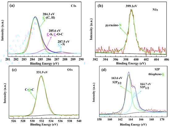 In order to obtain the elemental composition information, we performed X-ray photoelectron spectroscopy (XPS) tests on three polymer films. The test results show that there are four characteristic elements including C, N, O and S in the three D-A type polymers, as shown in Figure 3. Taking PBPE-1 as an example, the C (1s) peak at 284.3 eV demonstrates the presence of sp3 hybridized carbon atoms derived from the alkyl or alkoxy chains in D1 and D2; the peaks at 285.6 eV are ascribed to the binding energy of C-O-C and C-S bands in D1 and D2; and the binding energy peak at 287.5 eV is attributed to the C=N band in the A group, indicating the coexistence of three structural composition participants. The N (1s) peak with a binding energy of 399.1 eV can be ascribed to pyrazine-N [40] in the A unit. The O (1s) peak at a binding energy of 531.9 eV is attributed to the presence of C-O-C ether linkage [41]. The presence of C-S bands in thiophene rings was confirmed by the binding energy peak at 163.6 eV (S 2p3/2) and the peak at 164.7 eV (S 2p1/2). Similar results were obtained for the PBPE-2 and PBPE-3 polymers; the XPS spectra are presented in Figures S5 and S6. XPS data further indicate that D-A type random copolymers containing three monomer structures were successfully prepared.