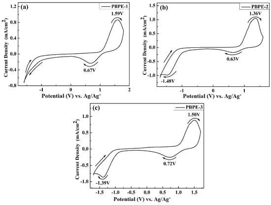 The electrochemical tests were carried out on an electrochemical cell consisting of a polymer-coated ITO/glass (3.0 cm × 1 cm) as the working electrode, Pt wire as the counter electrode and an Ag wire as the pseudo-reference electrode. The electrochemical properties of the polymers were tested and studied using a CHI 760 electrochemical workstation in a 0.2 M TBAPF6/ACN electrolyte solution. The voltage scanning ranges of PBPE-1, PBPE-2 and PBPE-3 were −1.6~2 V, −1.6~1.8 V and −1.8~1.7 V, respectively, and the scanning rate was 100 mV/s. The cyclic voltammetry curves are shown in Figure 4. In the cyclic voltammetry (CV) cycle, the three D-A type polymers were oxidized slowly with increasing applied voltage, with the oxidation peaks of PBPE-1, PBPE-2 and PBPE-3 located at 1.59 V, 1.36 V and 1.50 V, respectively, due to the generation of polarons during the p-type doping process. In the dedoping process, the reduction peaks of the three polymers appeared at 0.67 V, 0.63 V and 0.72 V, respectively. All three polymers have a distinct pair of redox peaks and approximately the same peak intensity, indicating their good doping and dedoping capabilities.