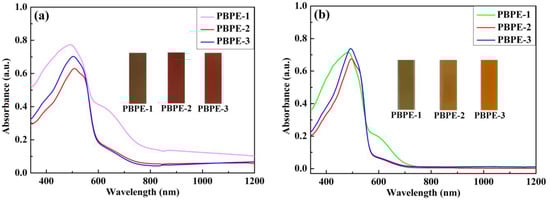 The optical properties of three D-A type polymer films and solutions were measured by a UV-Vis-NIR spectrophotometer, as shown in Figure 5. The UV-Vis spectra of the polymer films and solutions showed main broad absorption bands in the range of about 400 nm to 600 nm, with the maximum absorption peaks (λmax) of the polymers in solutions located at 481 nm, 496 nm and 493 nm, and λmax in films at 492 nm, 508 nm and 503 nm, for PBPE-1, PBPE-2 and PBPE-3, respectively. The maximum absorption peaks in films showed a weak bathochromic shift compared with those in solutions due to the accumulation of π-π stacking of the polymer films, resulting in reduced energy absorption. Compared with PBPE-1, the maximum absorption peaks of PBPE-2 and PBPE-3 polymer films or the polymer solutions showed a red-shift phenomenon, and the red shift of PBPE-2 was more obvious. This may be because an appropriate increase in donor ratio results in a more planar and rigid backbone of the polymer, which is conducive to electronic transition. Corresponding to the spectral absorption, the PBPE-1 film appeared brown with a relatively broad absorption peak, and the PBPE-2 and PBPE-3 films exhibited a similar magenta color due to their similar and adjacent absorption peaks. Furthermore, the absorption humps in the range of 650 nm can be ascribed to D-A charge transfer interactions. The optical and electrochemical data of three polymers derived from CV curves and UV-Vis spectra are listed in Table 1.