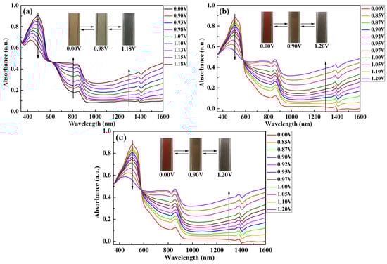 Spectroelectrochemical spectra of PBPE-1 (a), PBPE-2 (b), PBPE-3 (c) and corresponding color changes under different voltages.