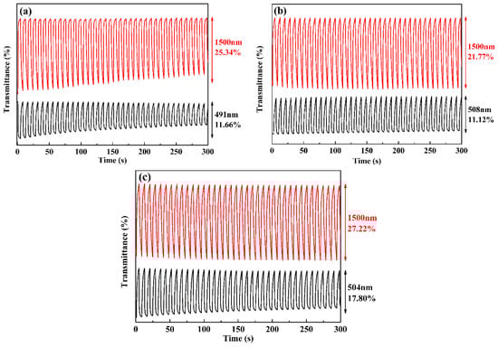 The cyclic square-wave voltammogram steps at different wavelengths of the polymers with 10 s, 4 s, 2 s and 1 s pulse times were tested in order to study the stability of the polymers and the influence of pulse time on optical contrast, as shown in Figure 8. For PBPE-1, at 491 nm, the ΔT% value was 12.34% with a pulse time of 10 s. When the pulse time was reduced to 4 s, 2 s and 1 s, the ΔT% value dropped to 11.66%, 11.42% and 8.51%, respectively. From 10 s to 1 s, the ΔT% value at 1500 nm dropped from 28.5% to 12.31%. Decreasing the step time intervals from 10 s to 1 s resulted in a reduction in the EC contrasts of PBPE-2 from 16.67% to 5.45% at 508 nm and from 34.07% to 9.83% at 1500 nm (Figure S7). The degrees of reduction were calculated to be 12.94% and 30.9% for PBPE-3 at 504 nm and 1500 nm, respectively (Figure S8). As can be seen from the above data, the optical contrast value is closely related to the length of residence time. Meanwhile, in general, the faster the response speed, the less the contrast change is affected by the residence time.