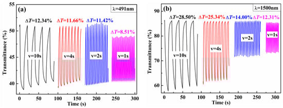 Electrochromic switching of PBPE-1 at 491 nm and 1500 nm with intervals of 10 s, 4 s, 2 s and 1 s.