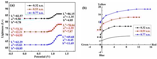 Three PBPE-1 polymers were selected with thicknesses of 0.32 au, 0.53 au and 0.77 au. In the neutral state, their brightness values were 82.57, 72.31 and 62.29, respectively. Before 0.75 V, the brightness of the films did not change significantly. As the voltage continued to increase, the polymer was oxidized, and the brightness was increased to 86.15, 78.04 and 69.68, respectively. As shown in Figure 9b, the (a*, b*) values of the polymer films with thicknesses of 0.32 a.u., 0.53 a.u. and 0.77 a.u. in a neutral state were (9.50, 9.78), (12.21, 14.55) and (15.83, 18.85), respectively; after the films were completely oxidized, the (a*, b*) values shifted to (−1.35, 4.05), (−1.35, 7.87) and (−0.45, 11.69), respectively. The polymer films with different thicknesses exhibited significant numerical changes in the L*, a* and b* values from the neutral state to the oxidation state, indicating that the transparence and the color of the polymer films underwent significant changes. The chromaticity test data of PBPE-2 and PBPE-3 are shown in Figures S9 and S10, respectively.