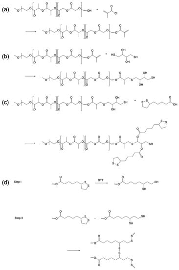 The commercial mPEG-b-PLGA has a –OH termination (1) that can be modified to obtain the crosslinkable copolymer suitable for crosslinking (Figure 1). The chemical modification of the polymer was performed in three steps. In the first step, we added a terminal double bond to the PLGA end-chain through the reaction with methacryloyl chloride (MA), to obtain the ene-terminated polymer (2). Product 2 was further modified with dithiothreitol (DTT) to add two –OH functionalizable groups (3). Product 3 was modified with lipoic acid (LA) to add two crosslinkable sites (4).