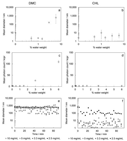 We evaluated the formation of water vesicles in the selected solvents by mean of DLS analysis. Measurements were performed on the solvent/water mixtures with increasing amounts of water weight from 0 to 6% (Table 1). Samples were added to a quartz cuvette and measured at 20 °C. The viscosities at 20 °C used for this analysis are 0.664 and 0.563 mPa·s for DMC and CHL, respectively, while the refractive indexes are 1.3687 and 1.4459, respectively [31,32].