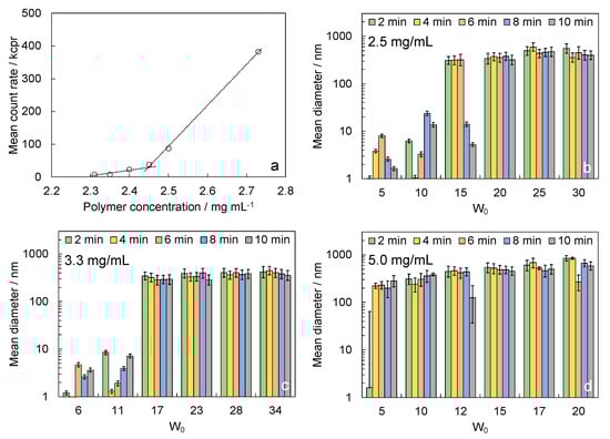 The CMC, calculated starting from polymer solution in CHL in three independent experiments, resulted in 2.5 mg/mL ± 0.1 mg/mL (Figure 3a). This was intended to be the lower concentration needed to obtain micelles with the fixed W0. Taking the previous experiments in consideration, the following experiments were focused on samples obtained from polymer solutions in the concentration range from 2.5 to 5.0 mg/mL.