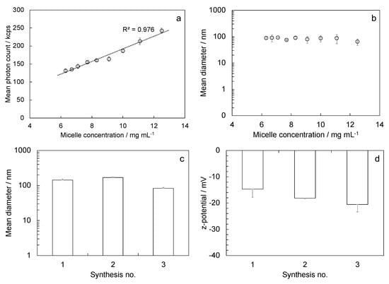 Characterization of stabilized reversed micelles: (a) mean photon count and (b) mean diameter calculated in dilution tests; (c) mean diameter and (d) z-potential evaluated in three repeated syntheses.