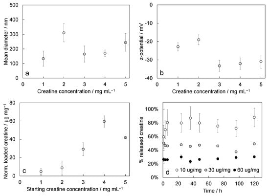 Characterization of creatine-loaded stabilized reversed micelles: (a) mean diameter and (b) z-potential of micelles loaded with different starting amounts of creatine; (c) amount of loaded creatine (μg) by varying the starting creatine solution concentrations, normalized to the actual amounts of micelles (mg); (d) percent of released creatine through time (μg) with respect to the actual amounts loaded, in the legend formulations are labeled according to the amount of creatine loaded per mg of RMs. In plots (a–c), the x-axis reports the starting concentration of the creatine solution used during the loading procedure.