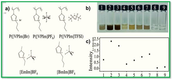- Chaban, V.V.; Fileti, E.E.; Prezhdo, O.V. Imidazolium ionic liquid mediates black phosphorus exfoliation while preventing phosphorene decomposition. ACS Nano 2017, 11, 6459–6466. [Google Scholar] [CrossRef] [PubMed]