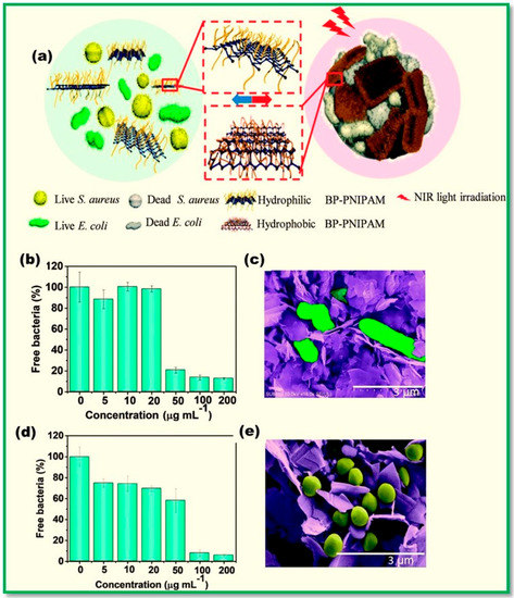 - Deng, S.; Wang, D.; Xiong, Z.; Zhang, S.; Li, D.; Zeng, J.; Zhang, X.; Zhao, Q. Thermo-responsive polymer black phosphorus nanocomposites for NIR-triggered bacterial capture and elimination. Environ. Sci. Nano 2022, 9, 1330–1340. [Google Scholar] [CrossRef]