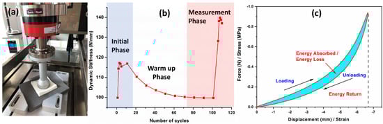 (a) The operation of the Zwick Roell LTM5 electro-dynamic testing machine on the foam samples. (b) The designed dynamic testing cycles profiles and (c) the typical force-displacement curve of the dynamic compression test and the energy representation from the curve.