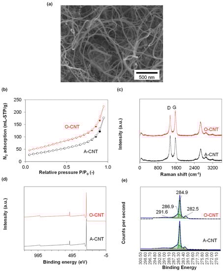 N2 adsorption and desorption isotherms of CNT were collected at −196 °C (Quantachrome Autosorb-1 Analyzer). Specific surface area was calculated using the Brunauer–Emmett–Teller (BET) model and total pore volume was determined from N2 uptake at a relative pressure of 0.95–0.96. Graphitization degree was calculated from the areas of D- and G-bands of carbon in Raman spectra acquired at a laser wavelength of 532 nm (XploRA PLUS, Horiba Scientific). X-ray photoelectron spectroscopy (XPS) of CNTs was conducted using an XPS Shimadzu Kratos AXIS Supra. The morphology of CNTs was characterized by a field emission scanning electron microscopy (FESEM, JEOL JSM-7600F). Ash content was determined by the combustion of samples in the air at 900 °C for 2 h.