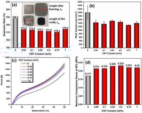 Figure 4a–d showed the expansion ratios (ER), abrasion resistance, and compression properties of the CNT/EVA foams. As shown in Figure 4a, the CNT/EVA nanocomposite foams showed lower ER than the neat EVA foam. The ER of the CNT/EVA foams decreased with increasing content of CNT up to 0.75 wt% and increased again at 1.0 wt% of CNT loading. A similar trend was observed with the density and foaming ratios of the CNT/EVA foams. This confirms the enhanced interactions between the CNT and EVA and improved? viscosity which affects the expansion of the cells. The abrasion resistance of the EVA foam was improved after the incorporation of CNT as can be seen in the reduction of the wear volume loss of the CNT/EVA foams compared to the neat EVA foam (Figure 4b). The compression stress of the EVA foam was also found to enhance with the presence of CNT (Figure 4c,d). The 0.5 wt% CNT/EVA foam exhibited the highest compression strength. The improvement in the abrasion resistance and compression strength could be due to the decent reinforcing effects of the oxygen functionalized CNT in the EVA. CNT with different aspect ratios has also been shown to improve the compressive properties of PMMA nanocomposite foams [].