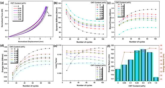 Dynamic impact response of CNT/EVA foams at the control impact force of 1.5 kN, (a) normalized force-displacement curves, (b) dynamic stiffness, (c) stored energy, (d) energy loss, (e) loss factor and (f) energy returned and energy absorption.