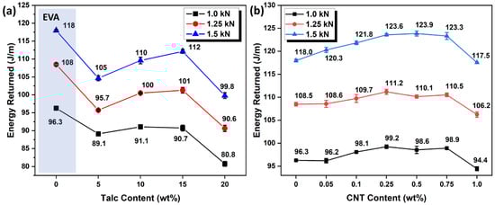 Energy returned of (a) talc/EVA foams and (b) CNT/EVA foams at different content and applied loads.