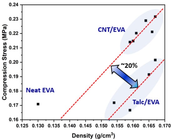 The compression stress versus density chart of the neat EVA, CNT/EVA, and talc/EVA foams.