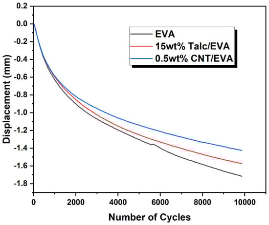 Displacement versus the number of cycles curves from the dynamic fatigue test for EVA, CNT/EVA, and talc/EVA foams.