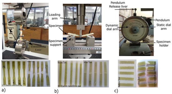 (a) Tensile testing setup and specimens. (b) Flexural testing setup and specimens. (c) Impact testing setup and specimens.