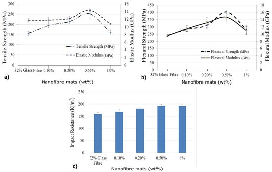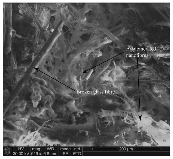 Glass fiber composites have a major role in various engineering applications due to their design flexibility, ease of manufacturing, and low weight compared to conventional materials such as steel [1,2]. However, the failure at the matrix-rich interlaminar regions due to poor mechanical properties is a cause of concern, and even with the higher volume fraction of glass fibers (60%), these matrix-rich regions exist [3]. Therefore, researchers are focused on improving the interlaminar regions by adding secondary reinforcements such as nanofillers [4,5,6], and among them, polymeric nanofibers are gaining greater importance due to their ease of manufacturing with unique mechanical properties [6].