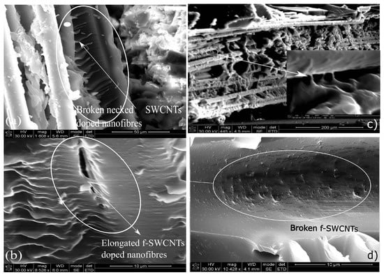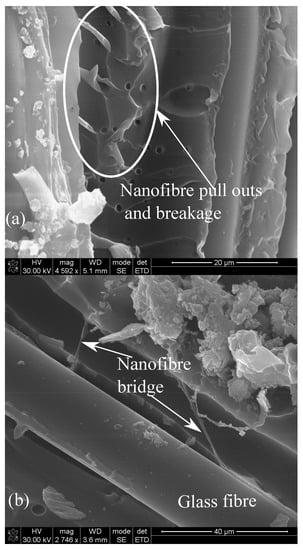 As discussed before, the bridging mechanism within the multiscale hybrid composites can be seen from the SEM images, as shown in Figure 11a,b. The functionalization of SWCNTs provided improved the dispersion, and further strengthened the bonding between f-SWCNTs and nanofibers, which could have resulted in a stronger nanofibers network within the interlaminar regions. Further, the alignment provided the required bridging, which resisted the crack propagation and promoted load transfer within the interlaminar region. Thus, the f-SWCNTs doped aligned nanomats strengthened hybrid composite provided the highest mechanical properties.