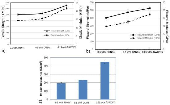 Mechanical properties of 0.5 wt% CANFs and 0.25 wt% f-SWCNTs doped with 0.5 wt% CANFs mats strengthened hybrid composites’: (a) tensile properties; (b) flexural properties; (c) impact properties.