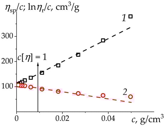 The intrinsic viscosity was defined by Staudinger as [] and by Kraemer as [], where is relative viscosity, is specific viscosity, and is the concentration of the dissolved substance in g/cm3. This definition emphasizes that the value characterizes a friction of the isolated macromolecule surrounded by solvent molecules. The method of extrapolating the and values to was not indicated by the authors of [,]. Various extrapolation plots have been proposed and are still being proposed to determine the intrinsic viscosity of polymers [,,,,,].