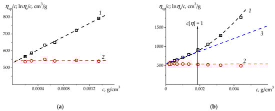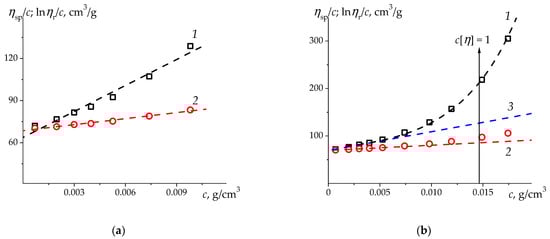 The Huggins (1) and Kraemer (2) plots for a sample of hydroxypropylmethylcellulose (HPMC) () in H2O at 25 °C []: (a)—in the range of relative viscosities , where extrapolation to was carried out and the values of intrinsic viscosity and Huggins and Kraemer parameters were determined , , ;, , ; ); (b)—in the entire range of concentrations (Line 3 is drawn as a tangent to the 2-nd degree polynomial fit in the initial range of values which corresponds to following values: , . Overall parabola (1) demonstrates the curvature of dependence of ηsp/c in contrast with one of lnηr/c in the entire interval ).