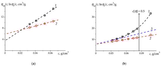 The Huggins (1) and Kraemer (2) plots for sodium polystyrene-4-sulfonate (PSSNa) (sample PSSNa-7 in Table 2) in aqueous 4.17 M NaCl (θ-solvent at 25 °C) [,] with different data approximation: (a)—linear fits (lines 1 and 2) in the range of relative viscosities (, , (1); , , (2)); and (b)—overall parabola (1) in the full measured range , Kraemer linear fit (line 2), and tangent (line 3) to the 2-nd degree polynomial fit in the range (which (3) leads to the values , ). Overall parabola (1) is drawn for clarity in order to emphasize the curvature of the dependence in the interval ).