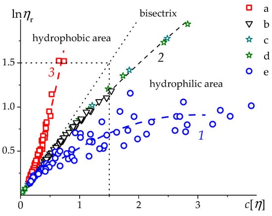 The dependence of natural logarithm of relative viscosity vs. resolved for PSSNa in aqueous solutions of different ionic strength [,] (a—4.17 M NaCl, ; b—0.2 M NaCl, , and e—H2O, ) and polystyrene (PS) in toluene, [] (c and d—samples with 146,000 and 600,000 g/mol, correspondingly). Dashed line represents the bisectrix (i.e., line ) of current coordinates, 1—is extrapolation of PSSNa data in H2O (e), 2—PSSNa in aqueous 0.2 M NaCl (b), PS in toluene (c and d), and 3—PSSNa in aqueous 4.17 M NaCl (a).