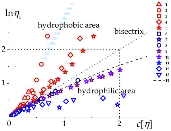 The dependence of the on the degree of dilution for MVAA-co-MVAC12H25 with different molecular masses in aqueous 0.1 M NaCl (1–5), DMFA + 0.1 M LiCl (6–8), in H2O (11–13), MVAA-co-MVAC6H13 (9) and MVAA-co-MVAC8H17 (10) in aqueous 0.1 M NaCl solution and PMVA in H2O (14). The dashed line separates two regions: the region of polymers with hydrophobic interactions and the region of polymers with hydrophilic interactions.