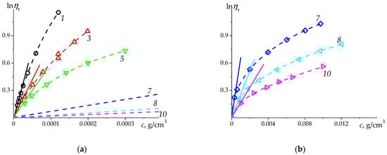 The natural logarithm of relative viscosity vs. concentration for PSSNa data in H2O at 25 °C. The dashed curves are the 2-nd degree polynomial fit of the presented data sets, the solid lines correspond to the initial slope of the dependences representing the intrinsic viscosity value, as at . The numbers next to the lines correspond to the sample numbering in the Table 5. The lines 7, 8 and 10 on the (a) represent the slopes from the (b).