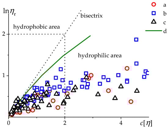 The plot vs. is very informative when comparing homologous series of different kind of polymers or the same series in different solution conditions. This plot allows the series under study to be separated into hydrophilic or hydrophobic systems, depending on the sign of the curvature of the second-degree polynomial describing evolution of in function of the degree of dilution. A positive sign corresponds to hydrophobic systems, and a negative one—to hydrophilic ones. A similar separation will occur between polymers in thermodynamically good solvents and polymer systems near θ-conditions.