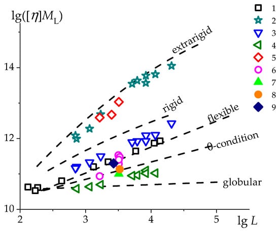 Intrinsic viscosity is the most sensitive characteristic to the size, shape, and their change for linear macromolecules in solutions. This is why the Kuhn-Mark-Houwink-Sakurada relationship () is so popular in polymer science. To date, an extensive library of these relationships for polymers of various structures and in various solvents has been formed and is being replenished []. If we put all these data on the vs. plot, we get a rather chaotic filling of this two-dimensional space. However, it turned out that this “pointillist picture” is transformed into a fairly clear ordered structure of the viscometric spectrum of linear macromolecules of different nature and structure, unfolded in size, if we take into account on this plot the mass of a linear chain length unit (), which characterizes the linear density of the macromolecule [,,]. This transformation follows from the fundamental Flory–Fox relation that , where is the volume occupied by the macromolecule in solution. Consequently, the value characterizes the volume occupied by the chain segment corresponding to the unit contour length of the macromolecule (which is conveniently chosen as a repeating link). This value will be the greater, the greater is the equilibrium rigidity of the macromolecule and the better is the thermodynamic quality of the solvent. Thus, by transforming the standard plot used to establish the classical KMHS relation, we obtained the plot (, which represents a sweep by their sizes of the entire spectrum of linear macromolecules so far studied. Linear macromolecules were divided into the following classes: extra-rigid, rigid, flexible in thermodynamically good solvents, flexible under θ-conditions, and globular. This plot is the result of an analysis of a large number of data in the literature and covers the area of macromolecules contour lengths changing by three orders of magnitude and the area of equilibrium rigidities of linear chains changing by approximately 500 times. Thus, by applying the experimental data to the obtained template/sweep, one can judge whether the studied polymer belongs to one or another class of linear polymers and get an idea of the length of the statistical segment or the persistent length of the chain. Let us analyze the results discussed in this paper in the coordinates vs. (Figure 9).