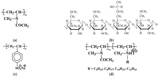 The structural formula of: (a)—poly-N-methyl-N-vinylacetamide homopolymer (PMVA); (b)—hydroxypropylmethylcellulose (HPMC); (c)—sodium polystyrene-4-sulfonate (PSSNa); and (d)—alkylated amphiphilic copolymer of N-methyl-N-vinylacetamide and N-methyl-N-vinylamine (MVAA-co-MVACnH2n+1).
