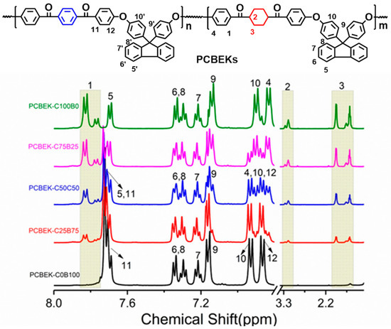 - Wei, J.; Shang, Y.; Xu, D.; Wang, Z.; Jiang, Z.; Gao, Y.; Zhang, H. Reinforcement of poly (ether ketone) by introducing fluorene groups and their effect on thermal and mechanical properties. Polym. Int. 2021, 70, 282–287. [Google Scholar] [CrossRef]