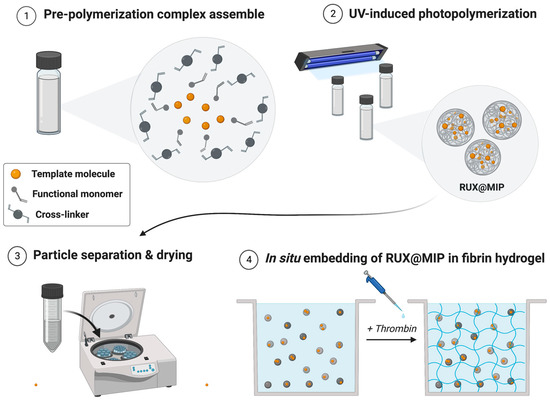 Schematic illustration of the fabrication process for the MIP-based DDS embedded in fibrin hydrogel. MIP synthesis starts with the assembly of a pre-polymerization complex using RUX, functional monomer, and crosslinker. After the UV-induced photopolymerization (24 h), RUX@MIP particles are separated by centrifugation and dried. MIP powder is the suspended in a fibrinogen solution, and the final DDS is obtained after adding thrombin to form a fibrin network; RUX@MIP = RUX-loaded MIPs. Created with BioRender.com (accessed on 19 January 2023).