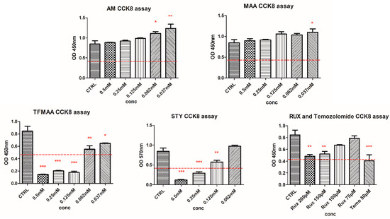 To investigate the cellular response to the residual monomers, we used a cell viability test named Cell Counting Kit-8 (CCK-8), which is based on the bioreduction of WST-8 (2-(2-methoxy-4-nitrophenyl)-3-(4-nitrophenyl)-5-(2,4-disulfophenyl)-2H-tetrazolium monosodium salt) by cellular dehydrogenases to an orange formazan product that is soluble in tissue culture medium. Briefly, C6 cells were seeded in NuncTM 96-well cell culture-treated plates (Thermo Fisher Scientific, Karlsruhe, Germany) at a concentration of 104 cell/well in 100 µL complete medium. Cells were allowed to adhere to culture plates. After 24 h, monomer solutions were added, obtaining different final concentrations as follows: 0.5, 0.25, 0.125, 0.062, and 0.037 mM for AM, MAA, and TFMAA; 0.5, 0.25, 0.125, and 0.062 mM for STY. RUX and temozolomide doses were also tested. After 24 h of monomer and drug exposure, 10 µL of CCK8 solution was added to each well; after 4 h of incubation, optical density was measured at 450 nm with a microplate reader Biotek Synergy 2 (Winooski, VT, USA). Statistical analysis was performed using one-way ANOVA followed by Dunnett’s multiple comparison test, using the untreated controls as references.