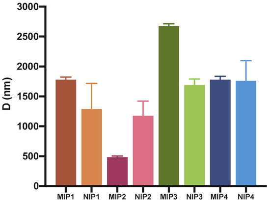 The range of hydrodynamic diameters of the synthesized polymeric DDSs assessed by DLS analysis were found in the sub-micro- and micrometer range. The smallest values were observed for MIP2 with 484 (±19.92) nm, followed by MIP4 with 1779 (±58.82) nm, MIP1 with 1780 (±44.29) nm, and finally MIP3 with 2677 (±37.07) nm. Interestingly, in terms of particle size, the differences between the nonimprinted polymers were less significant (Table 3).
