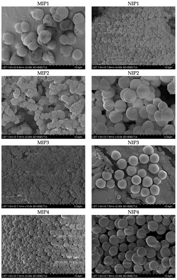 Particle morphology and size were evaluated also by SEM (Figure 5). The obtained micrographs confirmed the formation of conglomerates, assumed from the DLS evaluation. Whereas MIP 1, 3, and 4 were spherical and had a homogenous size distribution, MIP 2 particles had an irregular shape and a more heterogenous size distribution. Furthermore, MIP 1 had the largest particles (2–3 µm), while MIP 3 and 4 were smaller (~1 µm). In line with DLS results, MIP 2 had the smallest particles (0.4–1 µm) and, hence, the highest surface/volume ratio. This aspect is highly significant in drug delivery, since a higher ratio (surface/volume) may lead to higher drug loading and improved drug release. The nonimprinted correspondents were smaller than their imprinted counterparts, except for MIP/NIP 2. NIP 3 and 4 demonstrated the largest particles (~2 µm), followed by NIP 2 (~1.5 µm) and, finally, NIP 1 (~1 µm).