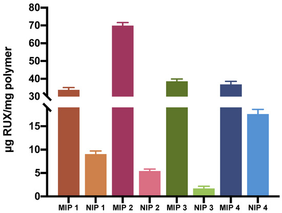 As mentioned beforehand, the MIP loading capacity (LC), involving both specific and nonspecific binding, was indirectly assessed by measuring free RUX from the supernatant solutions. MIP 2 showed the highest LC of 69.9 (±1.7), followed by MIP 3 with 38.6 (±1.3), MIP 4 with 36.9 (±1.7), and MIP 1 with 33.8 (±1.3) μg RUX/mg polymer, respectively (Figure 6).