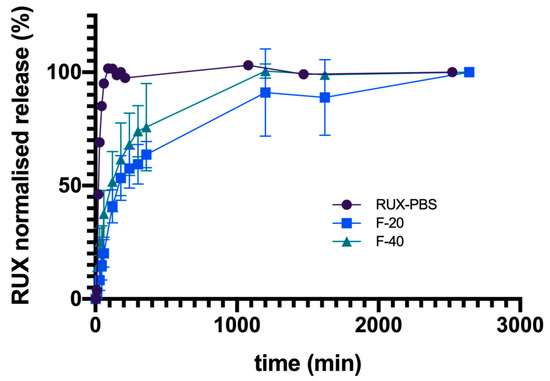 RUX normalized average cumulative transmembrane diffusion. Legend: F-20 samples contain 20 mg fibrinogen; F-40 samples contain 40 mg fibrinogen; PBS sample contains only RUX in PBS (see Table 1).