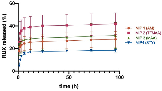 The second set of experiments was conducted at a pH of 5.5 (Figure 9), since it is considered that the tumor microenvironment is characterized by more acidic pH values [26]. At this pH, the cumulative percentage release values for RUX dropped by half in comparison with values obtained under physiological conditions in the case of MIPs based on acidic monomers (i.e., TFMAA and MAA) with 19.1% ± 1.2% and 16.7% ± 0.5% RUX for MIP 2 and MIP 3, respectively. For the AM-based polymer (MIP 1), values remained nearly unchanged, albeit representing the highest amount of released RUX at this pH (33.4% ± 9.4% RUX after 72 h), followed by MIP 4 (26.3% ± 3.6% RUX). The pH dependence of RUX release from the acidic acrylates was most probably related to the changes in the ionization state of these functional monomers, but steric rearrangements of the polymeric strands affecting the matrix’s permeability cannot be ruled out. Increasing the number of undissociated carboxyl moieties in the crosslinked polymeric scaffold may have led to the enhancement of noncovalent interactions (hydrophobic and hydrogen bond type bonding) with the drug molecule, impeding its release into the receiving medium. Moreover, the intermediate plateau was maintained for a shorter time, with a more evident tendency for leveling off. Nevertheless, although it is an important variable to consider in future developments of MIP-based DDSs loaded with chemotherapeutic agents, in this particular application, since the greater part of tumor is resected during surgery, the tumor microenvironment’s pH might actually be closer to the physiological value.