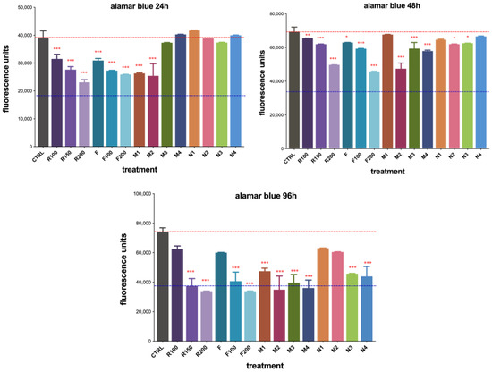 Alamar Blue viability assay of C6 glioma cells cocultured with polymers for 24, 48, and 96 h (*** p < 0.001; ** p < 0.01; * p < 0.05). Legend: CTRL = untreated control; R100/150/200 = free RUX in PBS 100/150/200 µM; F = plain fibrin hydrogel; F100/200 = RUX loaded fibrin gel 100/200 µM; M1–4 = RUX loaded MIPs 1–4; N1–4 = nonimprinted NIPs 1–4.