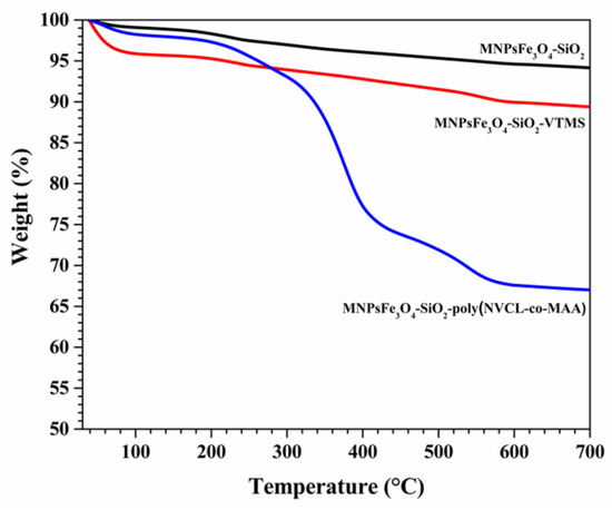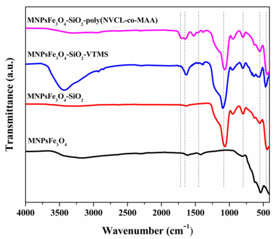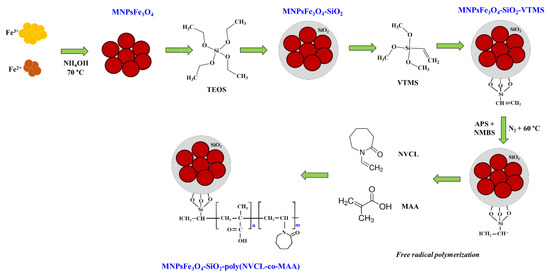 3.1. Synthesis of MNPsFe3O4-SiO2-g-Poly(NVCL-co-MAA) Nanocomposites